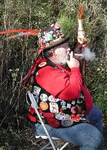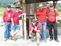 ECV flourished, in part, as the result of the miners' reaction to the "established" organizations such as the Masons and Odd Fellows. Those groups had come to the mining country prior to ECV, and when ECV appeared, the older, more established groups looked down upon the more rowdy nature of E Clampsus Vitus. ECV, on the other hand, made fun of the stuffed shirts of the Masons: they made great fun of the sashes and ceremonial attire of the "upscale" fraternities, and began dressing in red shirts and pinning on badges made of cut-out tin can lids. This practice, called "wearing the tin", continues to this day, although the badges are frequently professionally made. Members commonly dress in a red shirt, black hat and Levi's jeans. ECV titles reflected the tongue-in-cheek nature of the organization. Officials were called "Noble Grand Humbug," "Roisterous Iscutis," "Grand Imperturbable Hangman," "Clamps Vitrix," and "Royal Gyascutis." All members are officers and all officers, the organization professes, are of equal indignity.