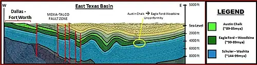 The Eagle Ford Group (also called the Eagle Ford Shale) is a sedimentary rock formation deposited during the Cenomanian and Turonian ages of the Late Cretaceous over much of the modern-day state of Texas. The Eagle Ford is predominantly composed of organic matter-rich fossiliferous marine shales and marls with interbedded thin limestones. It derives its name from outcrops on the banks of the West Fork of the Trinity River near the old community of Eagle Ford,[1] which is now a neighborhood within the city of Dallas. The Eagle Ford outcrop belt trends from the Oklahoma-Texas border southward to San Antonio, westward to the Rio Grande, Big Bend National Park, and the Quitman Mountains of West Texas.[2] It also occurs in the subsurface of East Texas and South Texas, where it is the source rock for oil found in the Woodbine, Austin Chalk, and the Buda Limestone,[3] and is produced unconventionally in South Texas and the "Eaglebine" play of East Texas.[4]