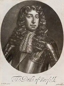 In 1672, the office of Marshal of England and the title of Earl Marshal of England were made hereditary in the Howard family.[2][3][4] In a declaration made on 16 June 1673 by Arthur Annesley, 1st Earl of Anglesey, the Lord Privy Seal, in reference to a dispute over the exercise of authority over the Officers of Arms the powers of the Earl Marshal were stated as being "to have power to order, judge, and determine all matters touching arms, ensigns of nobility, honour, and chivalry; to make laws, ordinances and statutes for the good government of the Officers of Arms; to nominate Officers to fill vacancies in the College of Arms; [and] to punish and correct Officers of Arms for misbehaviour in the execution of their places".[5] Additionally it was declared that no patents of arms or any ensigns of nobility should be granted, and no augmentation, alteration, or addition should be made to arms, without the consent of the Earl Marshal.