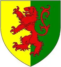 Arms of "Bigod Modern": Party per pale or and vert, overall a lion rampant gules, adopted by Roger Bigod, 5th Earl of Norfolk (1269–1306), after 1269 following his inheritance of the office of Marshal of England from the Marshal family