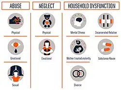 Adverse childhood experiences (ACEs) are correlated with physical and mental health problems in adolescence and adulthood,[1] including cardiovascular disease, chronic obstructive pulmonary disease, autoimmune diseases, substance abuse, and depression,[2][3] however, some of these problems are not inevitable outcomes of ACEs.[4]