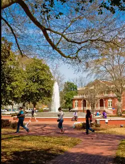 The main campus, also known as the east campus, is about 530 acres (2 km2) in an urban residential area of downtown Greenville. The 158 buildings on main campus comprise more than 4.6 million square feet (430,000 m2) of academic, research, and residential space.[8] Many of the Main Campus buildings feature the Spanish–Mission style architecture; inspiration drawn from Thomas Jarvis' time as an ambassador to Brazil.[19][20] He wanted to bring the unique architecture to eastern North Carolina. On the main campus, there are five districts: Campus Core, Downtown District, Warehouse District, Athletic fields and the South Academic District. On the Campus Core, there are 15 residence halls which are divided into three separate neighborhoods.[21] In the middle of the mall is the replica of the cupola on the original Austin building.