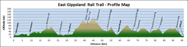 The East Gippsland Rail Trail travels from just east of the current Bairnsdale railway station along the old Gippsland railway line easement, past or through the small towns of Nicholson, Bruthen, Nowa Nowa, and Newmerella, with a short connecting path taking it into Orbost. Water and most facilities are only available in these towns, so trail users are required to be self-sufficient. The trail follows the long gradual inclines and sweeping curves of the former railway line, reaching a maximum altitude of 129m at Colquhoun.[2]