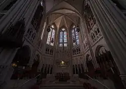 A "sounding board" is mounted above the pulpit, which served, prior to modern microphone and speaker systems, to project the preacher's voice into the nave. The imposing reredos is constructed of Alabama limestone. The Last Supper, carved by John Angel, is regarded as one of the two outstanding achievements of his career (the other being the bronze doors of St. Patrick's Cathedral in New York City). The scene was carved from a twenty-two-ton rectangular block of Hauteville marble.[3]