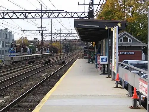 East Norwalk station first opened in 1885 to serve the quickly growing East Norwalk neighborhood.[8] The original station building was replaced c. 1897 by a smaller structure on the opposite side of the tracks.[8] That station would continue to serve until c. 1939 when it was replaced by another structure across the tracks and subsequently removed.[8] A separate westbound shelter was built some time around 1950, and both structures would serve until the current building was constructed by Metro-North in the 1980s.[3][8]