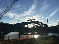 ![]() The East River Bridge in 2015, a few days after opening. The old bridge is visible in the background, as the green arch. | |