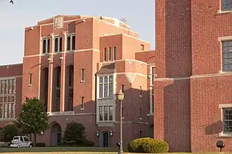 The last building was a three-story, H-shaped structure, with a main lateral section and four projecting wings. Designed by James R. Edmunds Jr. and Herbert G. Crisp, who had designed the new Western High School building almost a decade earlier, the campus at E. 33rd and Loch Raven Boulevard was noted for its structural design and large, shady yard. It has a steel and concrete superstructure frame with red brick cladding and carved limestone trim in the Tudor Revival or (Jacobethan) style. Closed in 1986, this building was renovated in the 1990s. It is considered a historical/architectural landmark in the City and is currently owned and used for offices by the Johns Hopkins Medical Institutions, a part of the Johns Hopkins Hospital and the Johns Hopkins University institutions. The Eastern High School building at East 33rd St. was listed on the National Register of Historic Places in 2000, which is maintained by the National Park Service of the U.S. Department of the Interior.[17]