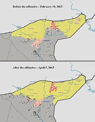 The Eastern al-Hasakah offensive was launched in the Al-Hasakah Governorate during the Syrian Civil War, by the Kurdish-majority People's Protection Units, Assyrian militias, and allied Arab forces against the jihadist Islamic State (ISIL or ISIS), with the intent of retaking the areas of the Jazira Canton that had been captured by ISIL.[5] Subsequently, the Syrian Armed Forces also launched an assault against the jihadists, without coordinating with the YPG.[25]