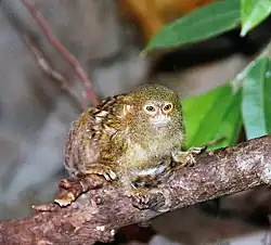 The eastern pygmy marmoset weighs around 119 grams and have a head size ranging from 33.7 to 38.9mm, being one of the smallest New World monkeys.[3][4] In the wild, full grown adult males weigh approximately 110 grams whereas adult females can weigh around 120 grams.[5] All pygmy marmosets share a common attribute where they have a mane of fur covering their ears, arms that are longer than their hind legs, and they have no protocone in their first upper premolar tooth.[4] Due to their specific diet, the eastern pygmy marmoset also has large lower incisors and a strong V-shaped lower jaw.[4] The eastern pygmy marmoset also has claw-like nails which are beneficial for actions such as poking holes in tree bark to obtain food, as well as the claw-like nails allows them to cling vertically to tree trunks.[6]