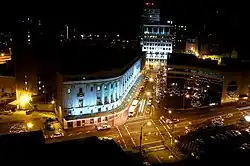 The Student Living Center, which is located at 100 Gibbs Street, is the dormitory building of the Eastman School of Music. In 1991, the new building was opened at the corner of Main and Gibbs Streets, replacing the University Avenue dormitories built nearly 70 years earlier. It is a four-story quadrangle and 14-story tower surrounding a landscaped inner courtyard, and contains its own dining hall. The majority of students enrolled in the undergraduate program live on campus in this building.