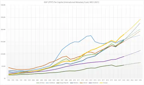 The economy of Georgia is an emerging free market economy. Its gross domestic product fell sharply following the dissolution of the Soviet Union but recovered in the mid-2000s, growing in double digits thanks to the economic and democratic reforms brought by the peaceful Rose Revolution. Georgia continued its economic progress since "moving from a near-failed state in 2003 to a relatively well-functioning market economy in 2014".[26] In 2007, the World Bank named Georgia the World's number one economic reformer.[27]