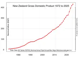 New Zealand has a highly developed free-market economy.[22] As Of 2025, New Zealand's nominal GDP was US $248 billion.[23] In the 2025 IMF rankings New Zealand was the 52nd-largest national economy in the world when measured by nominal gross domestic product (GDP) and the 63rd-largest in the world when measured by purchasing power parity (PPP). New Zealand has one of the most globalised economies and depends greatly on international trade, mainly with China, Australia, the European Union, the United States, Japan and Korea. New Zealand's 1983 Closer Economic Relations agreement with Australia means that the economy aligns closely with that of Australia. Among OECD nations, New Zealand has a highly efficient and strong social security system; social expenditure stood at roughly 19.4% of GDP.[24][25][26]