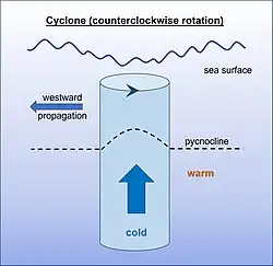 An intuitive description of this mechanism is what is defined as eddy-centric-analysis based on sea-surface level.[3] In the Northern hemisphere, anticlockwise rotation in cyclonic eddies creates a divergence of horizontal surface currents due to the Coriolis effect, leading to a dampened water surface. To compensate the inhomogeneity of surface elevation, isopycnal surfaces are uplifted toward the euphotic zone and incorporation of deep ocean, nutrient-rich waters can occur.[4]