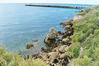 The jetty extends eastwards into Gulf St Vincent and is 170 m in length. The jetty is supported by pylons in groups of four.[17] Divers and snorkellers can safely and closely observe dense, multi-coloured colonies of temperate corals and sponges on the jetty pylons. The pylons also provide refuges for various fish, crustacea, nudibranchs and other marine invertebrates.