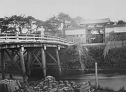 The Edo Castle gates (江戸城三十六見附) are the gates of Edo Castle in Tokyo, Japan. They were placed at crossing points (bridges) of the castle moats. Originally, there were 36 gates. Of these 36, 11 remain intact, including Sakurada Gate, while the rest have been demolished. Today, the central quarter of the castle is Tokyo Imperial Palace. Most gates in the palace are still intact, with gates on the moats leading into the palace still being used as security check points. However, all gates outside of the palace no longer exist. Some districts in Tokyo have been named after the castle gates.[1]