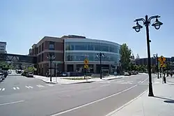 Serving the general educational needs of the local population are two public library districts, the Spokane Public Library (within city limits) and the Spokane County Library District. Founded in 1904 with funding from philanthropist Andrew Carnegie, the Spokane Public Library system comprises a downtown library overlooking the Spokane Falls and five branch libraries.[2] Special collections focus on Inland Pacific Northwest history and include reference books, periodicals, maps, photographs, and other archival materials and government documents.[3] The downtown Spokane Public Library branch located at 906 West Main has a collection size of 435,902 volumes and an annual circulation of 2,060,220 items per year.[4] The first downtown library building, The Carnegie Building, still stands 5 blocks from the current Downtown library.