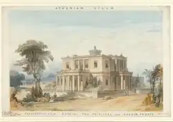 - 1834 Design for an Athenian Villa. Perspective View showing the principal and garden fronts.