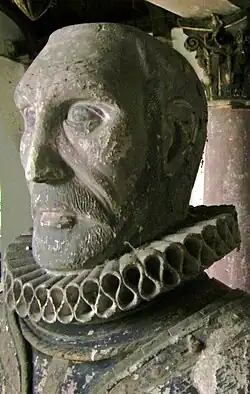 Susan Heigham's father Sir Thomas Heigham was the grandson and senior heir of John Heigham (died c. 1522), whose younger brother Clement Heigham of Lavenham (died 1500[22]) was father of Sir Clement Heigham of Barrow, Suffolk (died 1571) Speaker of the House of Commons in 1554, an open Catholic, and a notable persecutor of Protestants.[23] Speaker Higham's son Sir John Heigham (died 1626), however, with whom Lewknor had more to do, was a central patron of the puritan movement in East Anglia.[24] The Jermyns were similarly bi-partisan. Martha Jermyn's father Sir Thomas died in 1552, and her brother Sir Ambrose Jermyn (died 1577) was reportedly a fervent Roman Catholic and strong persecutor of Protestants in East Anglia during the reign of Queen Mary,[25] but by another account took immediate steps to curb the excesses of commissioners as soon as Elizabeth came to the throne.[26] His son, Sir Robert Jermyn (died 1614), however, was an uncompromising puritan and patron, and the associate of John Heigham.[27][28]