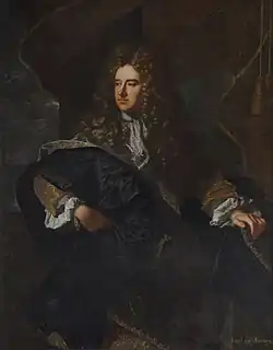 In 1704, he was dismissed from office by Queen Anne after objecting to the foreign policy initiatives of Lord Godolphin. After his dismissal, Lord Jersey was activity involved in Jacobite schemes, using his wife, who was a Roman Catholic, as a useful go-between.[1] Despite this, shortly before his death he had been nominated to attend the Congress of Utrecht by the British government. In 1711 the Queen was reluctantly persuaded to bring him back into the Cabinet as Lord Privy Seal, but he died immediately afterwards.[2] He died on 25 August 1711, the day of his investiture, of apoplexy.[4]