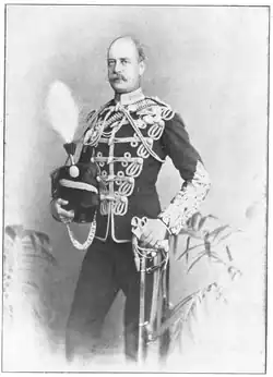 Wood succeeded Kerr as commander of the regiment upon his retirement in May 1881,[5] with Wood gaining the full rank of lieutenant-colonel in June.[11] In February 1884, he embarked aboard the troopship HMS Jumna for the return journey to England following the end of the Hussars service in India. However, the ship was intercepted 20 miles outside Aden and given new orders to sail with haste for Suakin in the Khedivate of Egypt. The regiment disembarked and was supplied with horses from Baker Pasha's Cavalry and the Egyptian Gendarmerie,[5] with the military objective of destroying the power of the Sudanese military commander Osman Digna. Wood commanded the command of the Cavalry Brigade until the arrival of Sir Herbert Stewart from England, commanding it at the Battles of El Teb and Tamai.[5] He was mentioned in dispatches during the conflict and was made a Companion of the Order of the Bath in recognition of his service in it.[12] He was promoted to colonel in November 1883.[13]