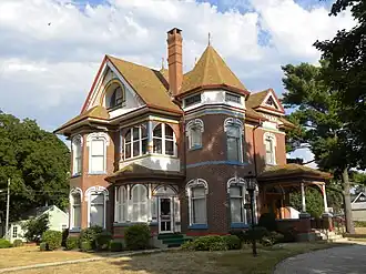 The Edwards-Swayze House is a historic building located in Nevada, Iowa, United States. Clayton F. Edwards, a local merchant, had this house built in 1878. He sold the house to Emma Swayze, the wife of banker W.F. Swayze, in 1890 when he relocated to Kennard, Nebraska. The house follows a vernacular form with elements of the Queen Anne style that were not fully integrated or carried though.[2] The 2+1⁄2-story brick structure features an irregular plan, octagonal turret, hip roof, shingled gable ends, enclosed porches, and window hoods. It was listed on the National Register of Historic Places in 1978.[1]
