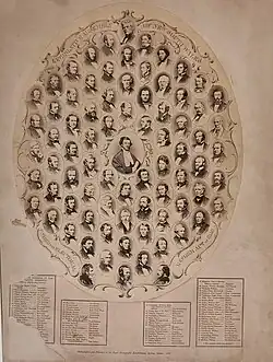 In October 1859, the first copies of Dalton's composite photograph of 79 portraits of the members of the Legislative Assembly of New South Wales were made available for sale. Sourcing such a large number of individual portraits required 3–4 months of Dalton's time and the result was touted as being, far beyond anything of its kind previously attempted in the colony.[27] At the centre of the image was Sir Daniel Cooper wearing his official robe while around him were members of his administration, supported by those who occupied prominent positions in the political arena. At 43 x 33 centimeters the final print was thought to be a convenient size for either framing or transmission to distant friends.[28][29] The photograph, along with his "crayotypes", was displayed in that year's conversazione hosted by the Philosophical Society in the hall of the Australian Subscription Library, in Bent Street, Sydney.[29] It is clear that by the end of 1859 Dalton was using a range of photographic processes including portraits in crayon, oils, watercolours, paper, collodion, as well as microscopic and stereoscopic photography.[30][31][32]