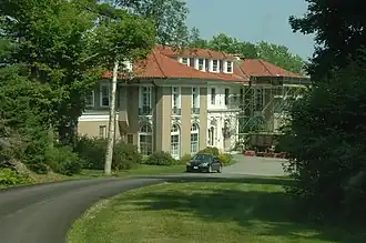 The first summer house built on this property was called "Sonogee", and was destroyed by fire within two years of its construction. Mr. and Mrs. Walter G. Ladd commissioned the noted Boston architect Guy Lowell to design the present building, which was completed in 1910. They called it "Eegonos", reversing the spelling of the previously named estate. The property was described in an architectural journal in 1910, along with another Lowell commission, Eden Hall, a performance hall in Bar Harbor which burned down in the 1947 fire. The house remained in the Ladd family until 1949, and was used as dormitory housing for a French language school from 1959 to 1975.[2] Since 1975 the house has been owned by various private individuals and groups.[3] In 2020 USA Today listed the property as the grandest house in Maine.[4]