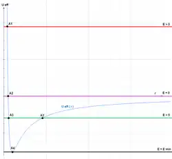 Only two variables are needed, since the motion occurs in a plane. Substituting the second expression into the first and rearranging gives where is the effective potential.[Note 1] The original two-variable problem has been reduced to a one-variable problem. For many applications the effective potential can be treated exactly like the potential energy of a one-dimensional system: for instance, an energy diagram using the effective potential determines turning points and locations of stable and unstable equilibria. A similar method may be used in other applications, for instance, determining orbits in a general relativistic Schwarzschild metric.
