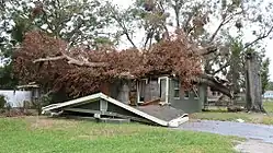 Heavy rainfall in Estero flooded neighborhoods and left roads impassible. A total of 105 homes suffered minor damage, 17 received extensive damage, and 9 were destroyed.[105] On Estero Island, winds downed trees and power lines across the island, though structural impact was mostly limited to some roof and patio screen damage.[106] At Sanibel Island and Captiva Island trees and power lines fall throughout both islands, but little, if any, structural damage occurred.[107] In Cape Coral, winds downed fences, signs, and trees. Heavy rainfall left flooding on a few streets. However, left structural impact occurred in the city.[108] Similarly, tree loss was extensive in Fort Myers and property damage was generally minor. At the Edison and Ford Winter Estates, a fallen banyan tree crushed a portion of the picket fence around the museum. Some neighborhoods experienced street flooding, especially Dunbar and Island Park.[109] In North Fort Myers, extensive seawall damage occurred at properties along the Caloosahatchee River. A number of homes in the community suffered roof and window damage.[110] In Lehigh Acres, nearly 12 in (300 mm) of rain fell, leaving neighborhoods isolated.[111] Two fire stations were closed due to extensive wind and water damage.[112]