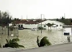 Most buildings in Key Largo suffered only light wind damage, though one business lost its roof. Storm surge and abnormally high tides flooded several single-family homes on the Florida Bay side of the island, damaged many docks, and destroyed a 100 ft (30 m) concrete seawall in Tavernier.[18] The Monroe County Sheriff's Office closed an 18 mi (29 km) stretch of U.S. Route 1 between Key Largo and Florida City and Card Sound Road due to debris and flooding.[24] The storm also impacted the mainland areas of the county. At Flamingo, a ghost town located in Everglades National Park, many of the facilities were severely damaged, forcing park officials to prohibit camping, lodging, and other services.[25]