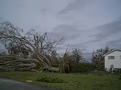 A man in the unincorporated community of Loxahatchee died after he was crushed by a tree that pushed him into the windshield of his vehicle.[99] The metal roof at Western Pines Middle School was peeled back, exposing multiple classrooms.[100] In nearby Royal Palm Beach, 331 homes were impacted.[91] Damage there reached about $9 million, including about $1.5 million to village property.[101] The village of Wellington suffered severe damage. The community center nearly lost its roof, the bleachers around the pool collapsed, and fences and canopies surrounding the tennis courts were destroyed. A few local parks experienced similar effects to their bleachers and sports facilities.[102] Palm Beach Central High School was severely damaged. Its kitchen and cafeteria lost portions of their roof, the theater and media center were flooded, the gym suffered a roof leak, and trees, signs, and fences were knocked down throughout campus.[103] Many trees and utility poles were snapped at The Mall at Wellington Green.[90] Approximately 3,955 homes were impacted and 4 others destroyed.[91] Overall, Wellington suffered almost $62 million in damage, with $50.4 million to property, and $3.8 million to public facilities, with repairs costs reaching almost $5.9 million.[104]