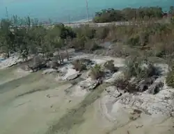At Lake Harbor, a tiny lakefront community near the western boundary of Palm Beach County, only seven homes were left standing after the hurricane.[94] About 743 homes[91] – roughly 80% of the dwelling in South Bay – were damaged,[92] and 63 residences were destroyed.[91] The city hall and the fire station suffered heavy roof damage.[95] In Canal Point, trees, branches, power lines, and electrical poles were toppled. Almost complete destruction of the community's mobile homes parks occurred. Several other homes and buildings were inflicted with serious damage.[88] Overall, damage occurred at about 60% of homes in Canal Point.[93] Some historical buildings damaged by hurricanes Frances and Jeanne in 2004 were destroyed by Wilma.[96] State Road 80, one of the only routes between eastern and western Palm Beach County, was closed after a Florida Power & Light transmission line fell across the highway about 1 mi (1.6 km) west of Lion Country Safari.[90] At the Loxahatchee National Wildlife Refuge (NWR), 85% of tree islands – "small, wetland forest communities imbedded in a matrix of freshwater marsh" – were damaged by the storm. Less than 50% of the canopies were removed at most tree islands, while the tree islands that suffered the worst impact had larger trees and were near the center of Loxahatchee NWR.[97] The office and visitor centers were both severely damaged and later rebuilt.[98]