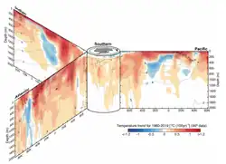 The warming rate varies with depth. The upper ocean (above 700 m) is warming the fastest. At an ocean depth of a thousand metres the warming occurs at a rate of nearly 0.4 °C per century (data from 1981 to 2019).[5]: Figure 5.4 In deeper zones of the ocean (globally speaking), at 2000 metres depth, the warming has been around 0.1 °C per century.[5]: Figure 5.4 The warming pattern is different for the Antarctic Ocean (at 55°S), where the highest warming (0.3 °C per century) has been observed at a depth of 4500 m.[5]: Figure 5.4