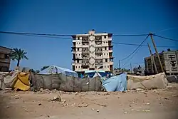 An initial survey conducted by the UNDP estimates that 14,000 homes, 68 government buildings, and 31 non-governmental organization offices (NGOs) were either totally or partially damaged. As a result, an estimated 600,000 tonnes of concrete rubble will need to be removed.[21] Since 2007, construction material have not permitted entry into Gaza, adversely affecting UN projects, in particular UNRWA and UNDP which were forced to suspend more than $100 million in construction projects due to lack of materials.[29] Another UNDP rapid damage assessment of 170 out of the 407 government and private schools in the Gaza strip found that ten schools were severely damaged, and that 160 government and ten private schools were partially damaged during the Israeli military operation. Eight kindergartens were severely damaged and 60 were partially damaged. The UN humanitarian office stated that repairing such schools remains an urgent priority. Ten UNICEF tents were brought to Gaza to be used as learning spaces in the most damage-stricken areas.[20] The Israeli Coordinator of Government Activities in the Territories has confirmed that there is as yet no intention to revise the policy prohibiting clearance of reconstruction materials which would enable aid agencies in Gaza to transition to rehabilitation and reconstruction.[26]