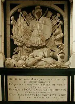 During the Battle of Lowestoft on 13 June 1665, Kortenaer commanded the van and was second in overall command behind Van Wassenaer. He was fatally wounded early in the battle on Groot Hollandia by a cannonball hitting his hip and buried in Rotterdam in a marble grave memorial engraved with a poem by Gerard Brandt: