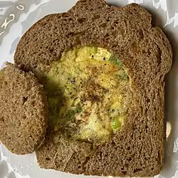The dish consists of a slice of bread with an egg in the middle, fried with butter or oil.[1][2][3] It is commonly prepared by cutting a circular or square hole in the center of a piece of bread, which may be buttered. The bread is fried in a pan with butter, margarine, cooking oil, or other fat. At some point, an egg is cracked into the hole in the bread. When the egg is added to the bread determines how well-done the egg and bread will be relative to each other in the final product. The pan may be covered or the bread flipped while on the heat to obtain even cooking. A waffle or bagel (with a large enough hole) can be substituted for the slice of bread.[4][5]