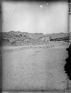 British infantry was brought forward to fortify and provide garrisons along the length of the railway. They formed a firm base for mobile operations and defence in depth for the huge administrative organisation advancing with the railway, in support of the Anzac Mounted Division and the 52nd (Lowland) Division.[88] The movement of the infantry across Sinai was eased by construction of wire netting roads also used by Egyptian Labour Corps, light vehicles, cars, and ambulances. This reasonably stable surface, which did not sink, was constructed from two or four rolls of rabbit wire; one inch mesh wire rolled out side by side, wired together with the edges fixed into the sand with long steel or wooden pegs to produce a reasonable track.[90][91]