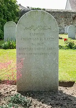 The records of the Commonwealth War Graves Commission (CWGC) show the 23 labourers killed at Boulogne on 6 September belonged to the 73rd and 78th Labour Companies. They are buried in the CWGC's Meerut Military Cemetery at Saint-Martin-Boulogne and the civilian Boulogne Eastern Cemetery.[17][8] CWGC records show that seven members of the 74th ELC died on 11 September and are buried at the CWGC's Les Baraques Military Cemetery, Sangatte.[18] Ahmed is commemorated on a memorial at the Mazargues War Cemetery, Marseilles.[19]
