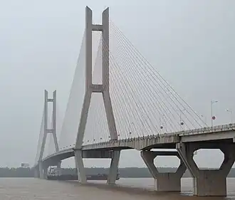 The Ehuang Yangtze River Bridge (Chinese: 鄂黄长江大桥) crosses the Yangtze River in Hubei, China. The bridge carries traffic on China National Highway 106 between Echeng, Ezhou south of the river and Huangzhou, Huanggang to the north. Construction of the bridge started in 1999 and it was completed in 2002. The bridge is 3,245 m (10,646 ft)[1] long and has a main span of 480 m (1,570 ft) placing it among the longest cable-stayed bridges in the world.[2]