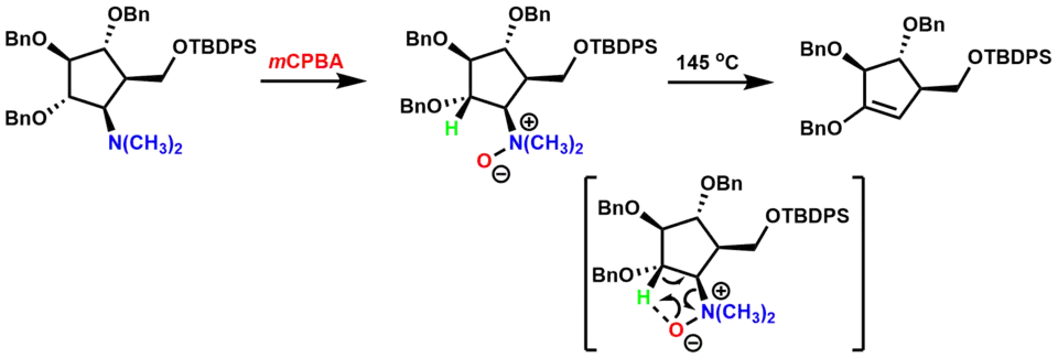 The Cope elimination (Cope reaction) is the elimination of a tertiary amine oxide to yield an alkene and a hydroxylamine through an Ei mechanism.[13][21] The Cope elimination was used in the synthesis of a mannopyranosylamine mimic.[22] The tertiary amine was oxidized to the amine oxide using m-chloroperoxybenzoic acid (mCPBA) and subjected to high temperatures for thermal syn elimination of the β-hydrogen and amine oxide through a cyclic transition state, yielding the alkene. It is worth noting that the indicated hydrogen (in green) is the only hydrogen available for syn elimination.