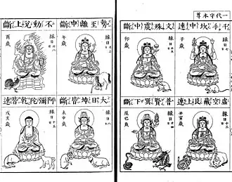 Eight Protectors of The Twelve Zodiac (Japanese: 十二支の御守り本尊[1]), also known as the The Eight Guardian Deities (Chinese: 八大守护神), Hachi-tai Futsu (Japanese: 八体仏), are guardian deities of the twelve zodiac animals in Japanese esoteric Buddhism, based on the Heavenly Stems, Earthly Branches, Twelve Nidānas and Godai.[2] Although they are called guardian deities, they are actually Yidams. According to Japanese Buddhist customs, each person born in the year of their birth is guarded by the Buddha or Bodhisattva corresponding to their zodiac sign. For example, the guardian deity of those born in the Year of the Rabbit is Manjushri.[3] Each guardian deity has a corresponding seed syllables, direction, and earthly branch.