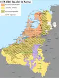 The years 1579–1588 constituted a phase of the Eighty Years' War (c. 1568–1648) between the Spanish Empire and the United Provinces in revolt after most of them concluded the Union of Utrecht on 23 January 1579, and proceeded to carve the independent Dutch Republic out of the Habsburg Netherlands. It followed the 1576–1579 period, in which a temporary alliance of 16 out of the Seventeen Provinces' States–General established the Pacification of Ghent (8 November 1576) as a joint Catholic–Protestant rebellion against the Spanish government, but internal conflicts as well as military and diplomatic successes of the Spanish Governors-General Don Juan of Austria and Alexander Farnese, Duke of Parma split them apart, finally leading the Malcontent County of Artois, County of Hainaut and city of Douai to sign the Union of Arras on 6 January 1579, reverting to Catholicism and loyalty to the Spanish crown.[1][2][3]