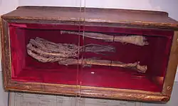 Inside the protestant church a mummified hand can be found. It is said that one day two forest owners west of Eisenberg argued about the boundary between their properties. A forester, who was an expert on the topic, was called to resolve the dispute independently. He was bribed by one of the two men and the court, trusting the foresters expertise, ruled in his favour. The forester had sworn a perjury. After he died they buried him but at the funeral his hand, which he had sworn the perjury with, burst through the coffin and they were unable to bury it. His hand was cut of and held as a souvenir that never decays.[9]
