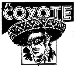 El Coyote (the Coyote or prairie wolf)[3] is the name of a fictional character very similar to Zorro (El Zorro), the Fox, although acting several years later (when California had transformed to be a part of the United States' "Wild West"). He first appeared in a Spanish Novelas del Oeste ("Stories of the West") Number 9 pulp novel in 1943, written by Carter Mulford, later as J. Mallorquí.[4] Mulford was one of several pseudonyms of the successful Spanish author José Mallorquí y Figuerola (1913–1972).[5] The novel was issued by the Spanish publishing house Editorial Molino. Mallorquí now started writing a series of extremely popular novels, with the character "El Coyote" in the head role, for Ediciones Cliper. Between September 1944 and late 1953 the hero appeared in a series of 192 pulp-like EL COYOTE novels,[6] with several revival editions throughout the years.[7] They covered 30 years of chronological adventures from 1851 (and earlier) until around 1876, or possibly later (the original Cliper novels were not published in strict chronological order). Cover illustrators were not always identical to inside illustrators. The novels (a Cliper edition already in 1947)[8] – and the comics – were also glued in nice collections and sold in hardbound "limited bookform" (Forum had one with all its novels,[9] and also one with the comics).
