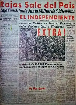 Since May 5, 1957, the country was in a national strike. The opposition newspapers, banks, factories, stores, schools, clubs, cinemas and theaters ceased their activities.[6] Rojas Pinilla resigned on May 10 and left the government in charge of a Military Junta. In the extra edition that El Independiente issued that day, the editorial column announced its full support to the agreement signed between Alberto Lleras Camargo and Laureano Gómez that helped to end the dictatorship, and that resulted in the return of democracy through a mechanism of alternation in Presidency and equal distribution of the public offices between liberals and conservatives. This agreement was known as the National Front.[6]
