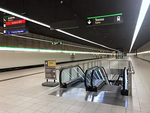 ![]() Mezzanine of El Perchel station, with escalator leading down to the platforms | |||||