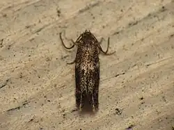 The wingspan is 7–8 millimetres (0.28–0.31 in).The head is dark grey, whitish-sprinkled, face paler or whitish. Forewings are blackish, somewhat paler-sprinkled; an oblique fascia before middle, in male indistinct and sometimes interrupted, a tornal spot, and an opposite costal spot (appearing together to form a perpendicular interrupted fascia) whitish, in female whiter and more distinct. Hindwings are grey. The larva is pale yellowish-grey; head black or pale brown; 2 with two black spots[2][3][4]