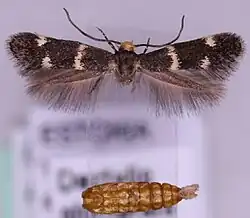 The wingspan is 10–11 millimetres (0.39–0.43 in). The moth flies from June to August depending on the location.[1] The head is light ochreous-yellow, seldom with a fuscous spot. Forewings are dark fuscous; a somewhat oblique fascia before middle, a small tornal spot, and another on costa beyond it ochreous-whitish, in female enlarged and more conspicuous. Hindwings are blackish grey. The larva is pale yellow; head pale brown.[2][3][4]