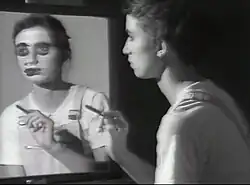 Still from Doppelgänger, video work 1979"The godmother of SHE DEVIL 8 is Elaine Shemilt with the video performance Doppelgänger. The work is part of a series of video experiments by women artists in the 1970s and 1980s, rediscovered and digitally remastered by the research project REWIND,.... Doppelgänger is one of two still existing videos of a series begun by Shemilt in 1974, salvaged in 2011. The term doppelgänger is used in German culture to indicate the evil twin (doppel / double, and gänger / goer). The doppelgänger of Elaine Shemilt is utterly feminine. The artist puts on makeup in front of the mirror in a ritual divided between the face and its reflected image that generates the double, the absolute protagonist of the finale."[23]