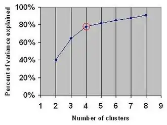 There are various measures of "explained variation" used in the elbow method. Most commonly, variation is quantified by variance, and the ratio used is the ratio of between-group variance to the total variance. Alternatively, one uses the ratio of between-group variance to within-group variance, which is the one-way ANOVA F-test statistic.[4]